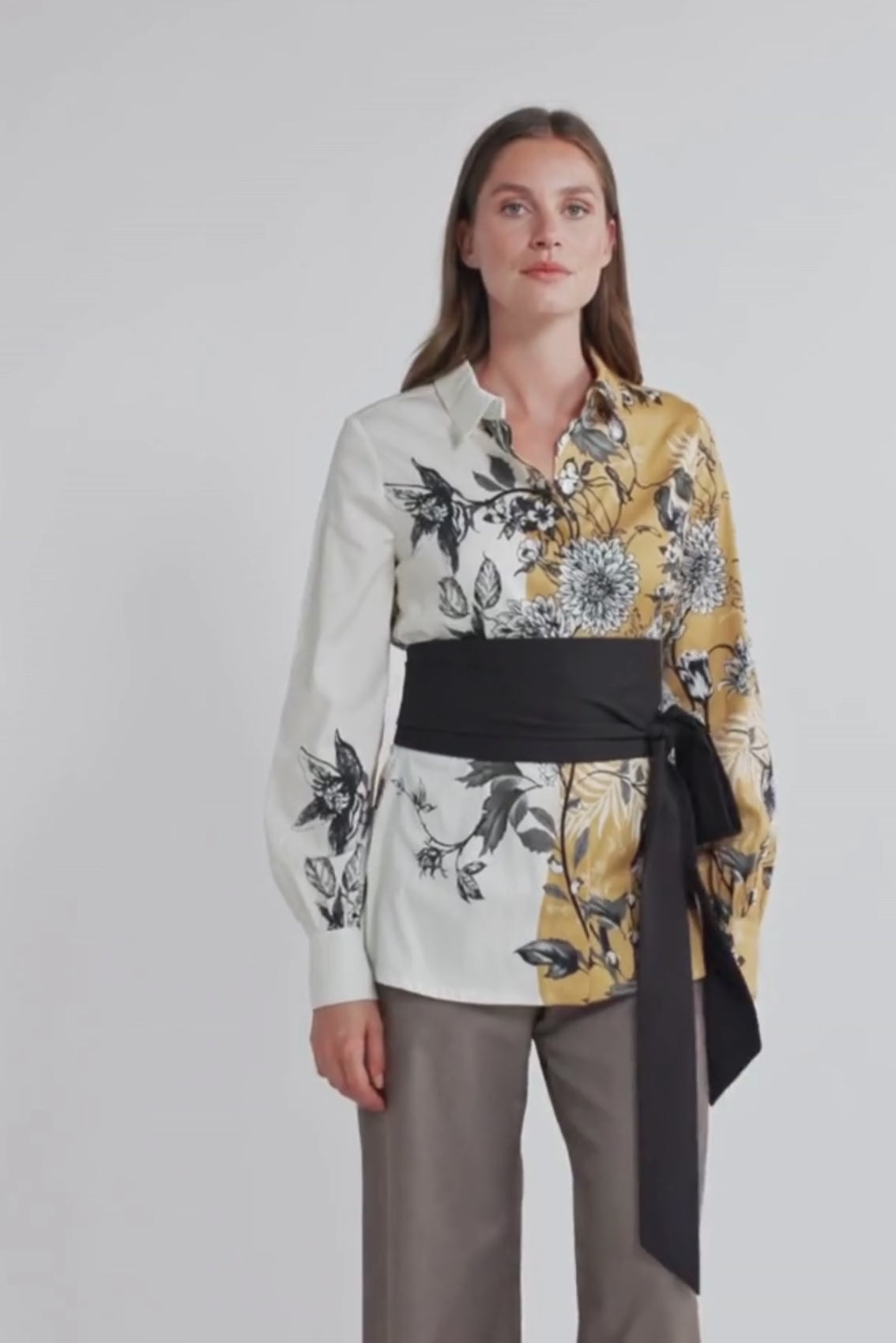Wenn sich das Licht golden färbt und die Natur in ihren schönsten Farben leuchtet – dann passt diese Bluse perfekt ins Bild. Der Print aus stilisierten Herbstblüten auf ockergoldenem und cremeweißem Fond wirkt wie ein gemaltes Herbarium. Der breite Bindegürtel in Schwarz formt die Taille und setzt einen eleganten Kontrast. Der Baumwoll-Elasthan-Stoff fühlt sich angenehm an – und bleibt dabei immer in Form. Ein stilvoller Begleiter für Alltag und Anlass. Passt perfekt zu eleganten Hosen oder einem schmalen Rock in gedeckten Tönen.