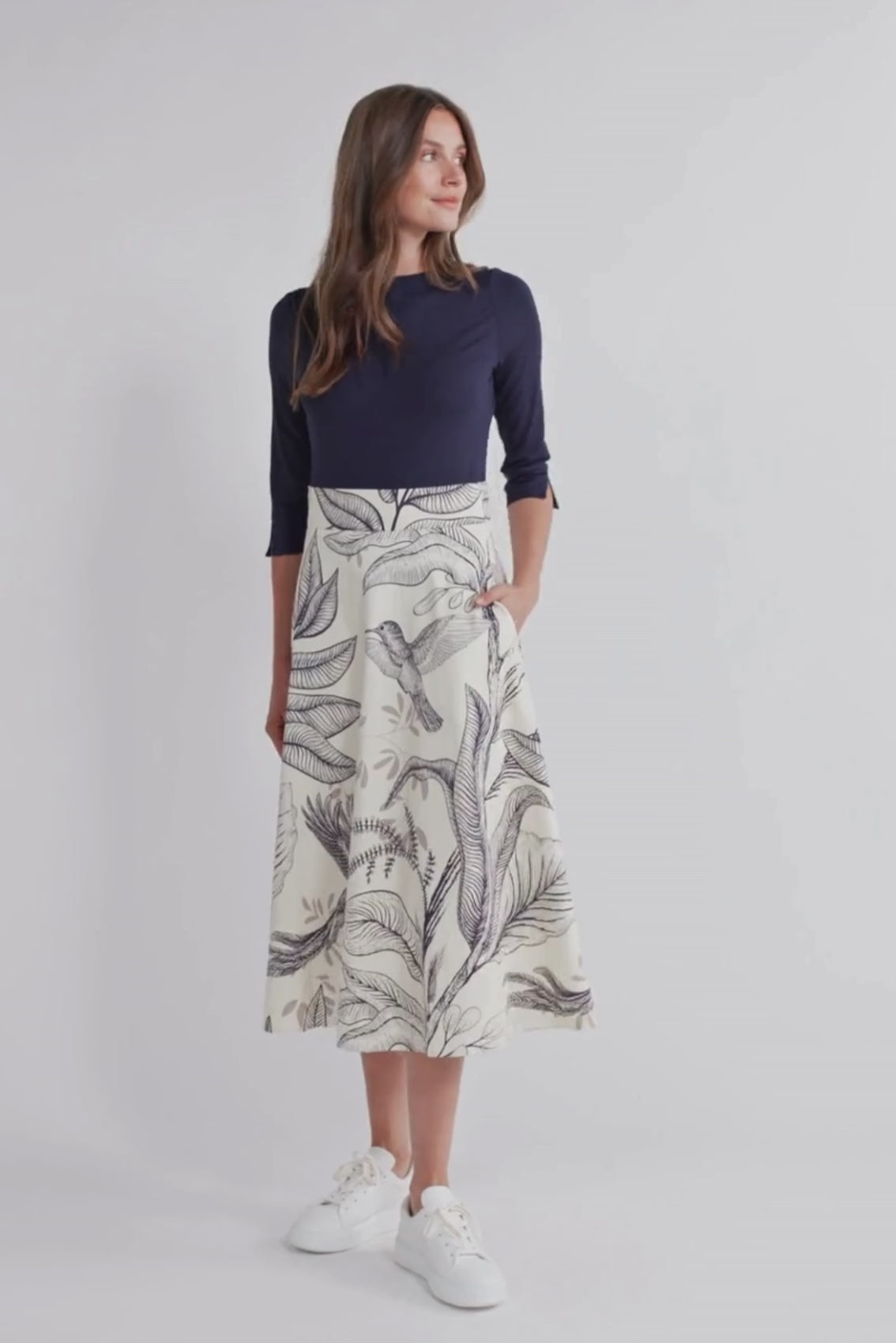 Wie gezeichnet im ersten Licht des Tages: Der Midi-Rock zeigt ein filigranes Vogel- und Blättermotiv auf elfenbeinfarbenem Grund – zart wie Nebel am Morgen. Die ausgestellte A-Linie formt eine feminine Silhouette, praktische Seitentaschen und das weiche Futter sorgen für Komfort im Alltag. Ein stilles Statement für alle, die das Feine lieben. Styling: Besonders schön zu schmalen Oberteilen in Creme, Dunkelblau oder Graublau.