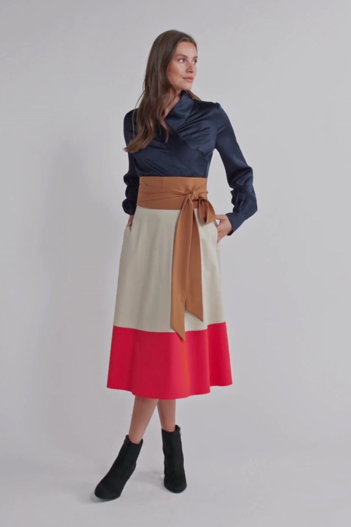 Ein Rock wie ein goldener Herbstspaziergang: Der weiche Cremeton kombiniert mit einem leuchtenden Rot am Saum bringt Wärme und Leuchtkraft in graue Tage. Die feminine A-Linie in Midi-Länge umspielt das Bein und sorgt für stilvolle Bewegungsfreiheit. Gefertigt aus hochwertigem Baumwollstoff, komplett gefüttert und mit praktischen Seitentaschen versehen, vereint dieser Rock Komfort mit Designanspruch. Der Reißverschluss in der hinteren Mitte fügt sich dezent ins Gesamtbild. Styling: Besonders schön wirkt der Rock mit einer navyfarbenen Bluse oder einem feinen Strickpullover in Creme oder Karamell.