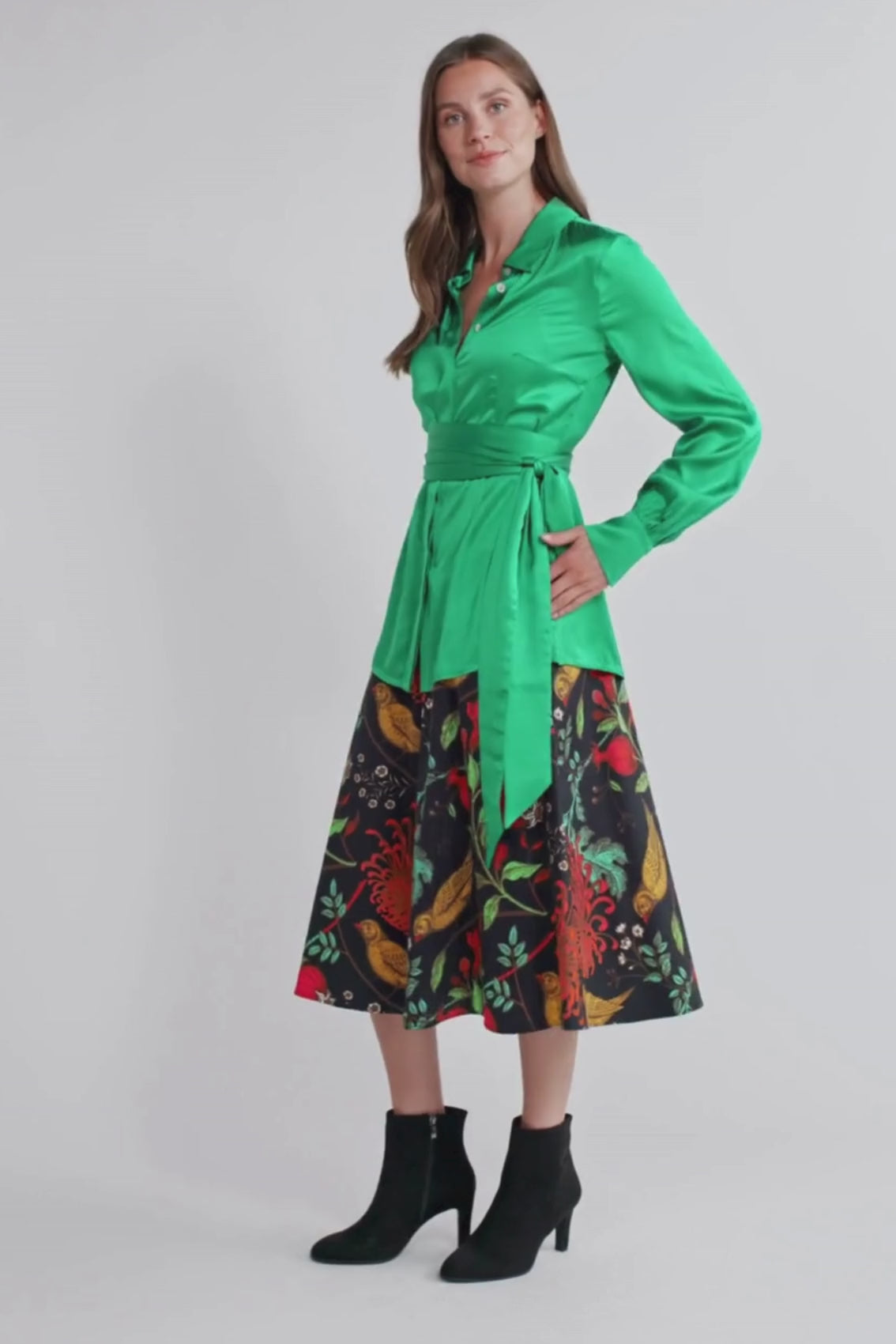 Diese Bluse vereint elegantes Design mit fließendem Satin und sorgt mit ihrem breiten Bindegürtel für eine feminine Silhouette. Ein seitlicher Schlitz verleiht dem Schnitt zusätzliche Raffinesse und angenehme Bewegungsfreiheit. Der klassische Hemdkragen, die langen Ärmel mit Manschetten sowie der leichte Glanz des Materials machen sie zum stilvollen Statement – ob im Alltag oder zu besonderen Anlässen. Besonders schön wirkt sie zu gemusterten Röcken oder als Farbakzent zu dunklen Basics.