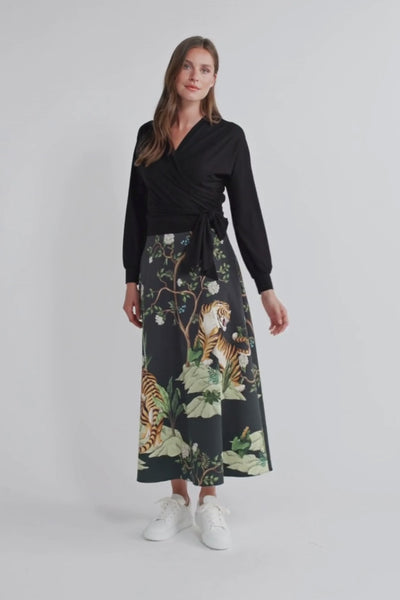 Elegant, soft, and versatile – this black wrap top in flowing jersey flatters your figure and suits both day and night. The long wrap ties offer flexible styling options and gently define your waist. A soft V-neckline and slim cuffs create a clean, feminine silhouette. Perfectly paired with statement skirts like our tiger print – understated yet impactful. A timeless piece you’ll reach for again and again.