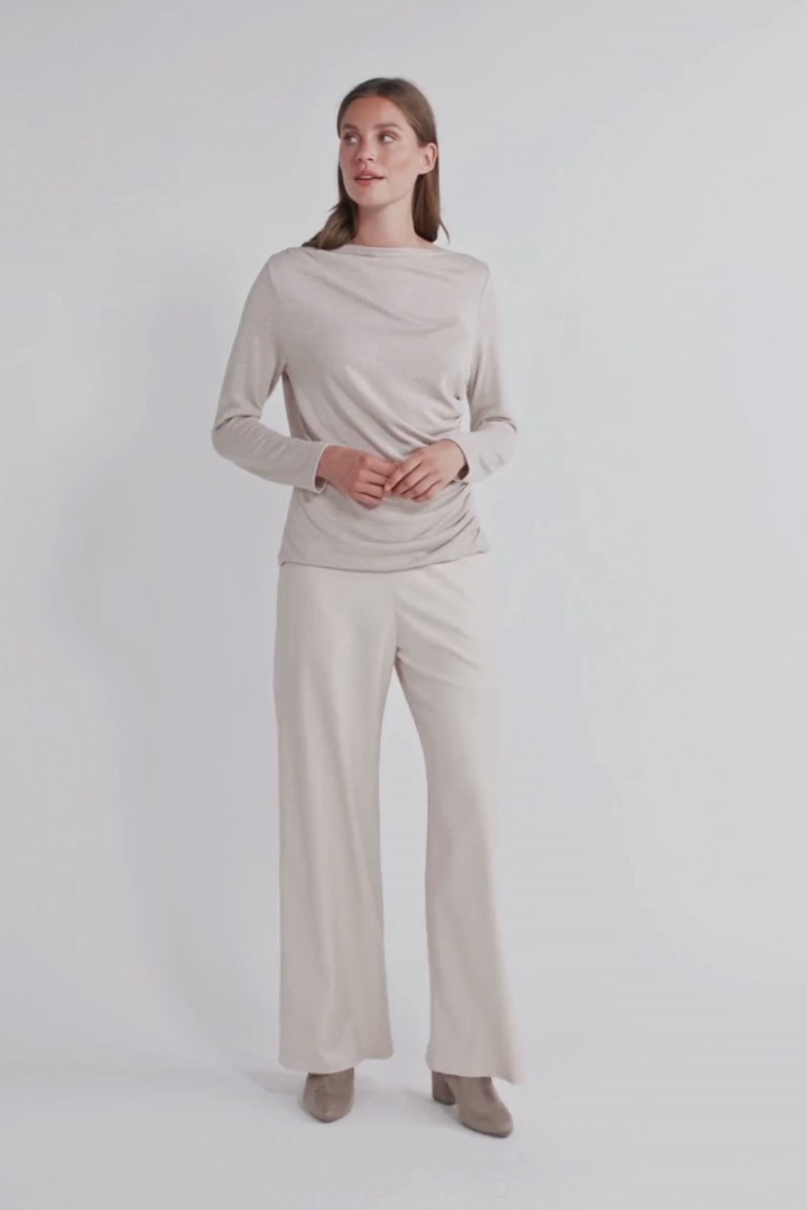 Fine glitter accents, a flattering cut and feminine gathers – this long-sleeve top brings effortless elegance to your everyday looks. The champagne-coloured fabric with shimmering metallic threads catches the light with every movement. The draped side detail subtly highlights the waist and creates an elegant silhouette. Thanks to the softly flowing material, it feels wonderfully comfortable against the skin. Perfect to pair with elegant skirts or slim-fit trousers.