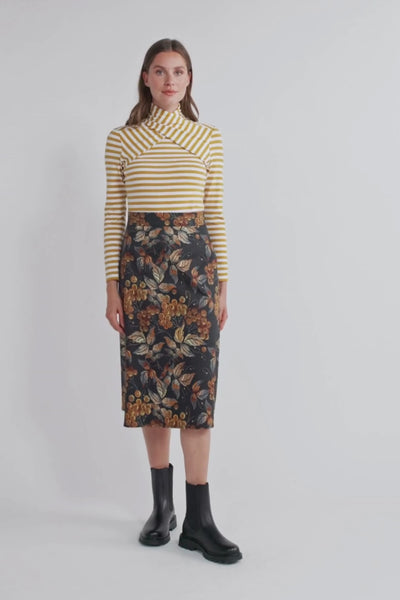 A skirt like an autumn poem: This skirt features a detailed print of golden leaves and berries in warm copper tones – set against a deep black background that lets the colours shine. The classic A-line silhouette with a feminine waist, practical side pockets and soft lining offers both comfort and elegance. Whether for everyday wear or special moments, this piece brings seasonal charm into your wardrobe. Styling: Perfect with tops in natural tones – like cream, mustard or rust. Stripes also create a lovely contrast.