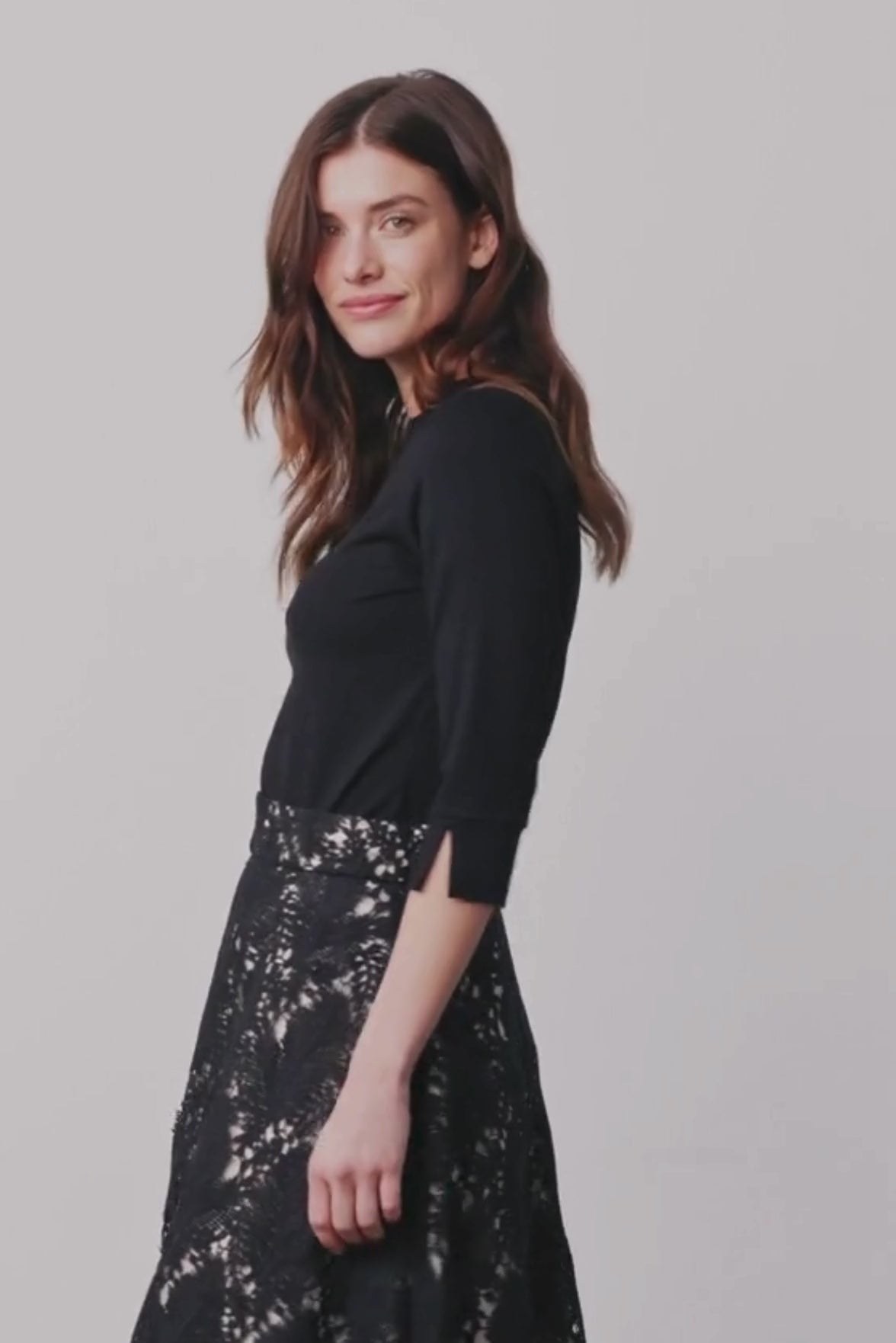 A staple style every woman should have in their collection, our top is designed with an elegant bateau neckline, three-quarter sleeves and slit cuffs. Fashioned in a soft, flexible fabric that is machine washable and resistant to pilling. We’ll pair it with our skirts.