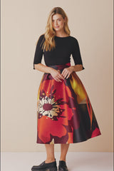 Dieser Rock aus Satin mit einer überdimensionalen Blume in kräftigen Herbsttönen bringt sofort Wärme in deine Garderobe. Feuriges Orange, leuchtendes Gold und tiefes Burgunderrot sorgen für eine Anziehungskraft, die viele bewundernde Blicke auf sich ziehen wird. Ein breiter Bund betont deine Silhouette, während Falten dem Rock mehr Fülle verleihen. Kombiniere ihn mit einem klassischen Oberteil, um den Rock in den Mittelpunkt zu stellen.
