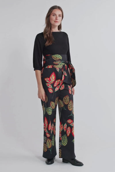 Weite Hose mit Bindegürtel Blätterprint Schwarz