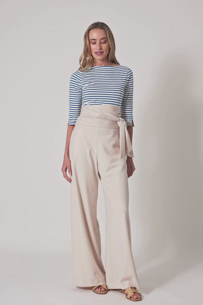 Elegant im Alltag: beige Wide-Leg Hose mit taillenbetontem Bindegürtel und Seitentaschen.