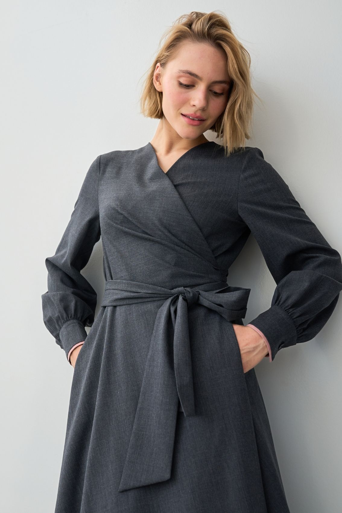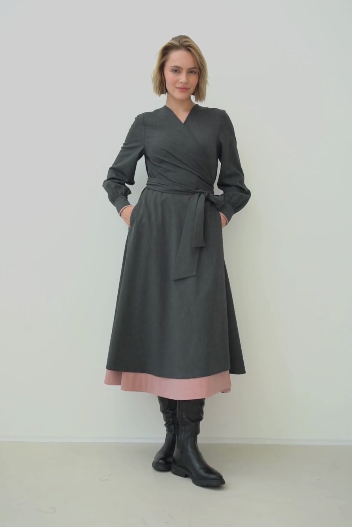Das Wickelkleid vereint Komfort mit einem Hauch Eleganz. Das raffinierte Wickeloberteil lässt sich wunderbar an der Taille binden und sorgt für eine schmeichelhafte Silhouette. Die Ärmel mit Knopfmanschetten und der dezente Kontrastbesatz verleihen dem Kleid eine besondere Note. Der schwingende Schlitzrock lässt die zartlila Lage darunter sanft zur Geltung kommen und sorgt für Bewegung. Perfekt kombiniert mit hochgeschlossenen Stiefeln, bist du auch an kühleren Tagen stylish und warm gekleidet. Mit diesem Kleid fühlst du dich jederzeit und bei jedem Anlass wohl und sicher.